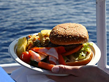 You’ll enjoy big, juicy burgers, grilled chicken breasts, and jumbo hot dogs with all the best topping options, cooked right on board and served hot off the grill. Ours is a hearty lunch paired with delicious homemade white chocolate macadamia nut cookies for dessert.
